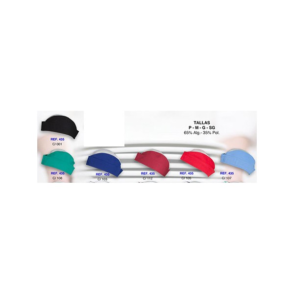 Gorro cocinero sarga colores. Color 65%algodón-35%poliester.Color 001 negro; 108 verde quirófano; 103 azulina; 112 burdeos; 105 rojo; 107 celeste.