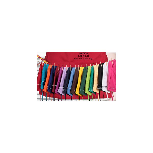 Delantal corto con bolsillo sarga colores. Medidas 0,30 x 0,60. Composición: 65%poliéster-35%algodón. Color 105; 115; 116; 103; 112; 119; 123; 104; 107; 124; 111; 118; 127; 108; 122; 001; 125.